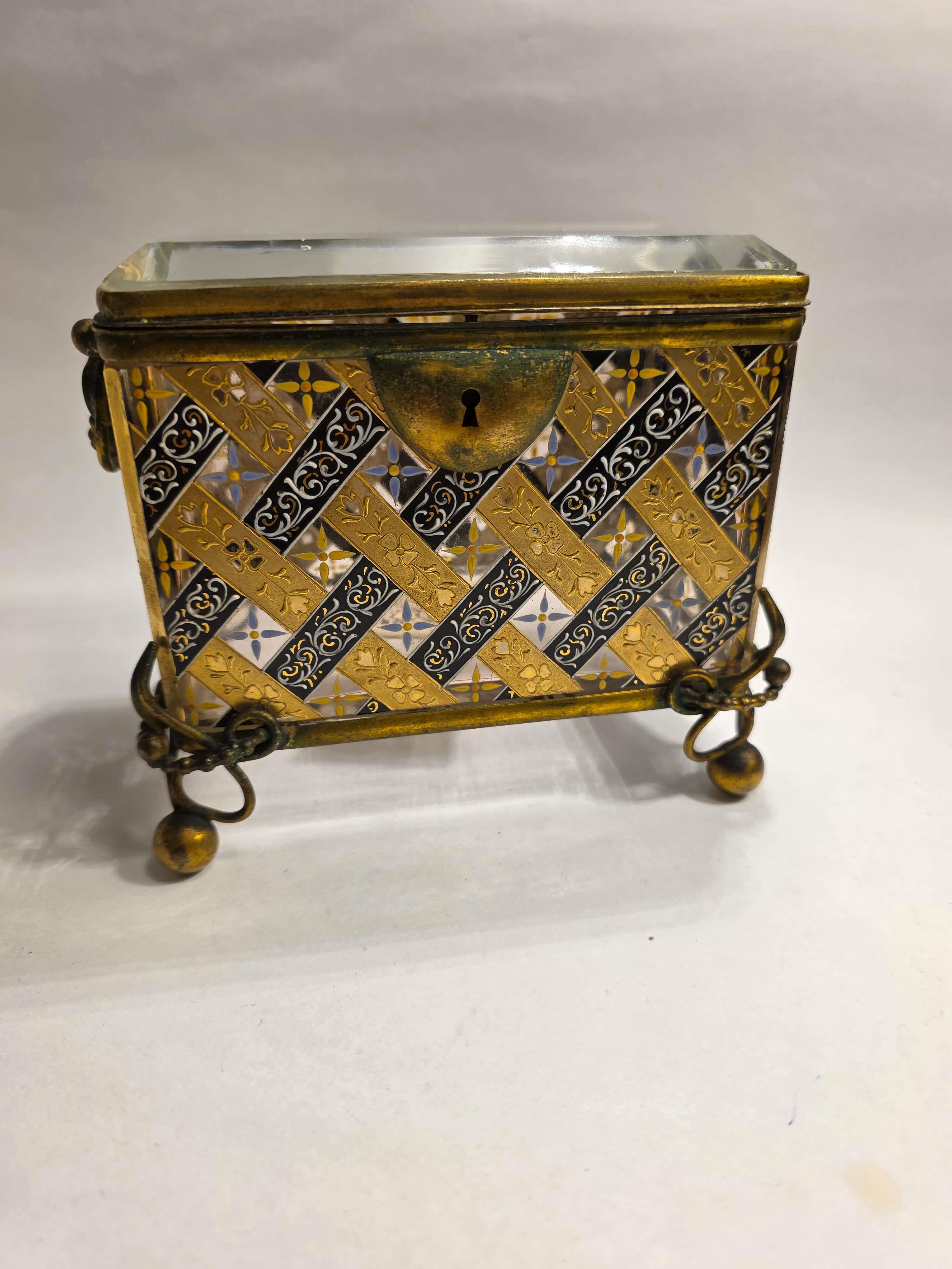 Pirinç detaylı, cam üzeri boyama mücevher kutusu.