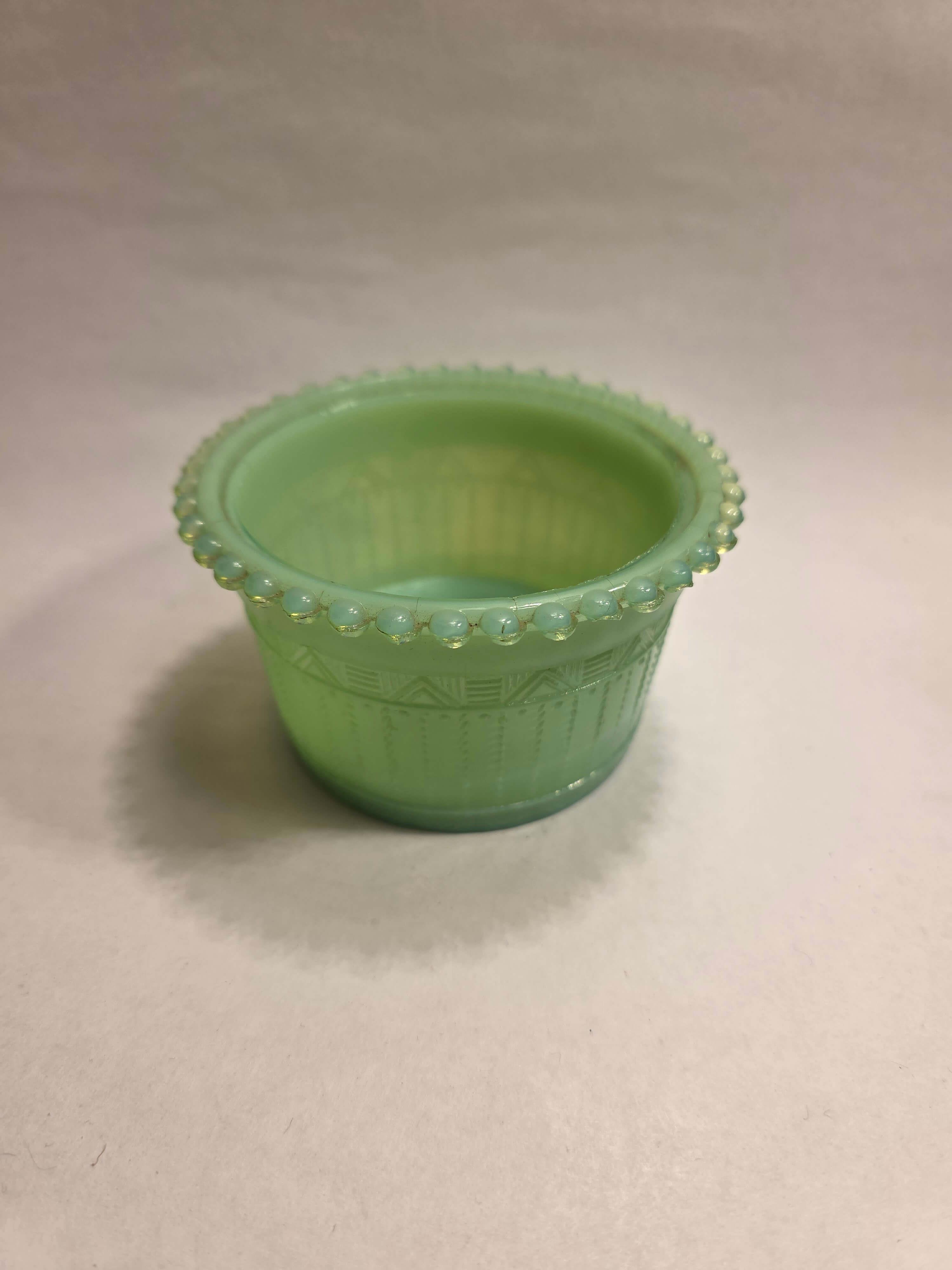 5,5 cm yüksekliğinde, yeşil cam mumluk.