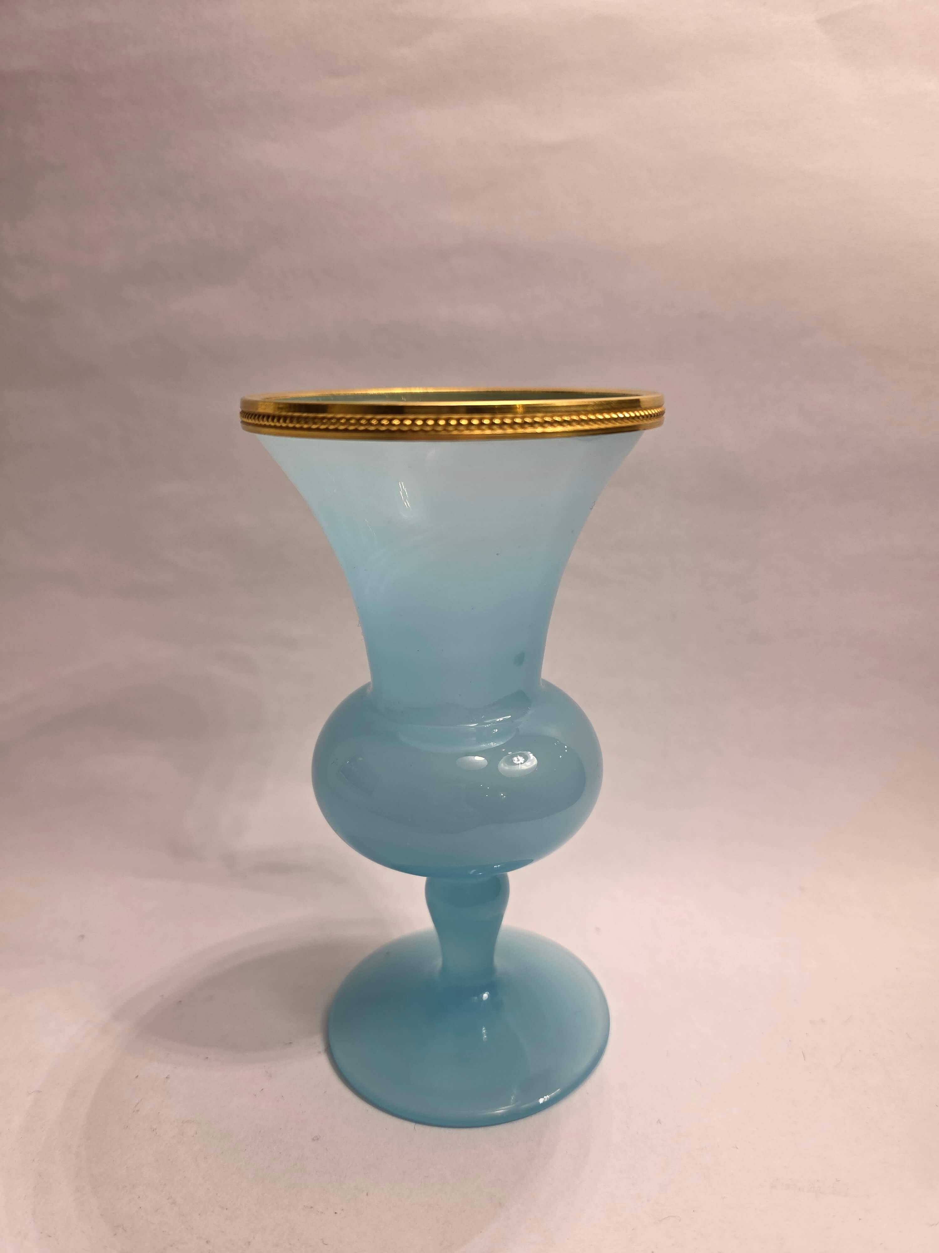 14 cm yüksekliğinde, pirinç detaylı, cam opalin vazo.